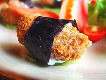 别看打着“牛”的招牌,看起来与我们在一般饭店里常见的“小牛排”没什么两样,但是所用的原料可是一点荤腥都没有。“牛排”使用切片的冬瓜代替,上面滚满了碎面包屑,经油炸而成,搭配味道酸甜的果酱,一道素斋“香裹小牛排”便新鲜出炉了。有点遗憾的是,这道菜虽然看上去堪称以假乱真,吃上去的口感和荤菜中的小牛排却不甚相像——要想把软软的冬瓜做成牛排那样挺括、有嚼头,绝不是件易事,咱们也不能太过于苛求了。